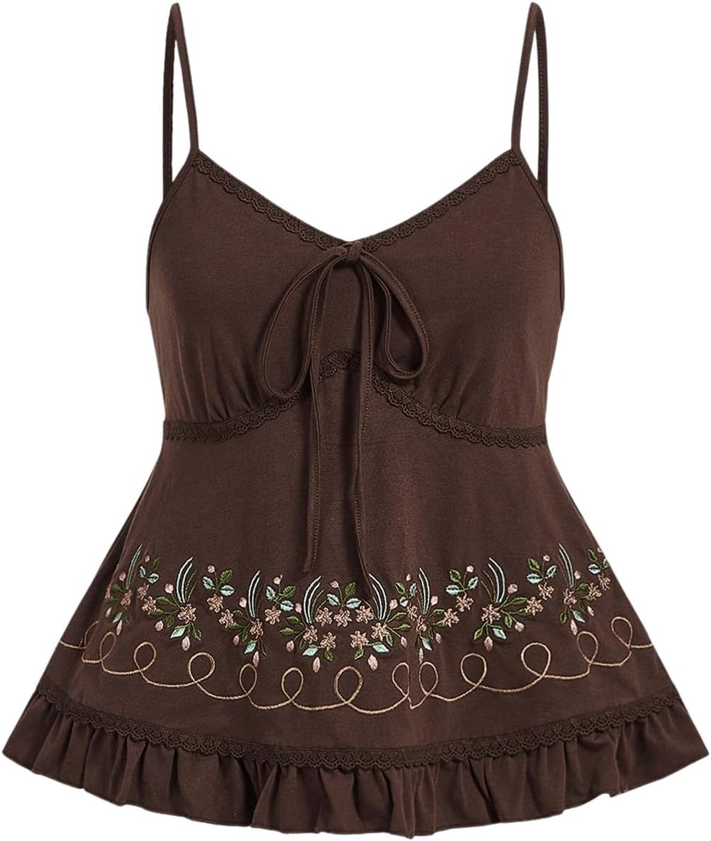 Embroidered Floral Front-Tie Camisole — Ruffled Hem | Trendy Summer Fashion Piece