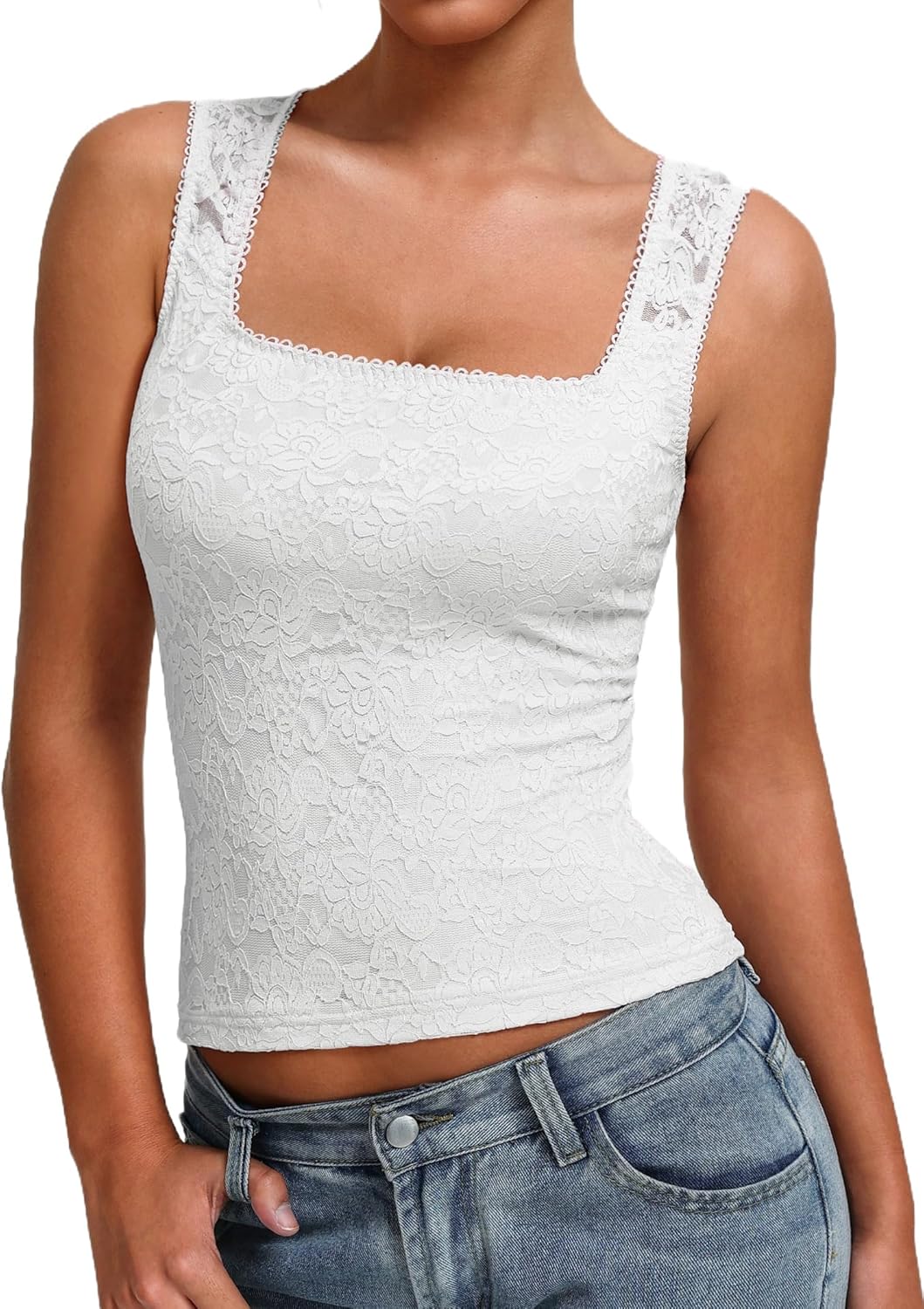 - Square Neck: The square neckline of tank top beautifully highlights the neck and collarbone, offering a modern and refined look. With its sleeveless design, this lace top provides freedom of movement.