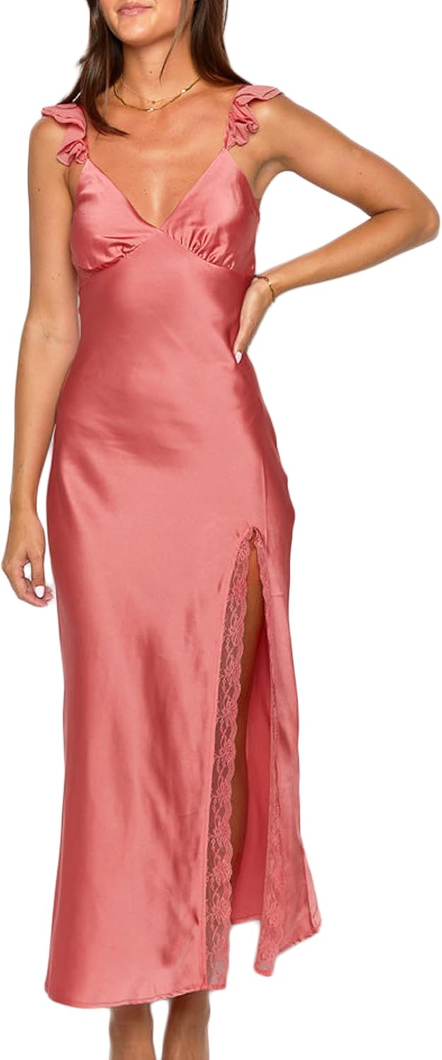 Summer Satin Lace Backless Spaghetti Strap Maxi Dress for Wedding Guest Silk Sleeveless V Neck Slit Ruffled Dress for Women